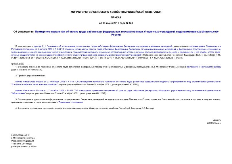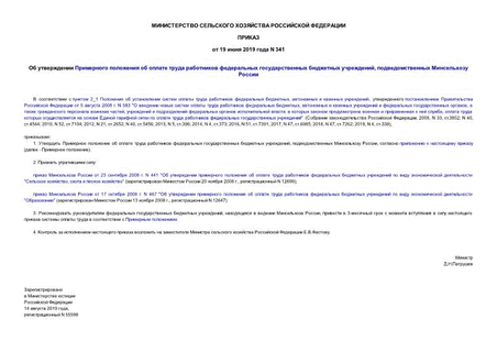 Приказ 341 Об утверждении Примерного положения об оплате труда работников федеральных государственных бюджетных учреждений, подведомственных Минсельхозу России