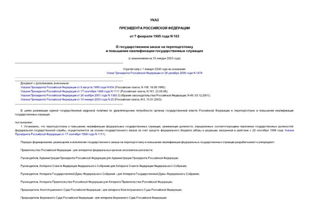 - О внесении изменения в Указ Президента Российской Федерации от 7 февраля 1995 года N 103 "О государственном заказе на переподготовку и повышение квалификации государственных служащих"
