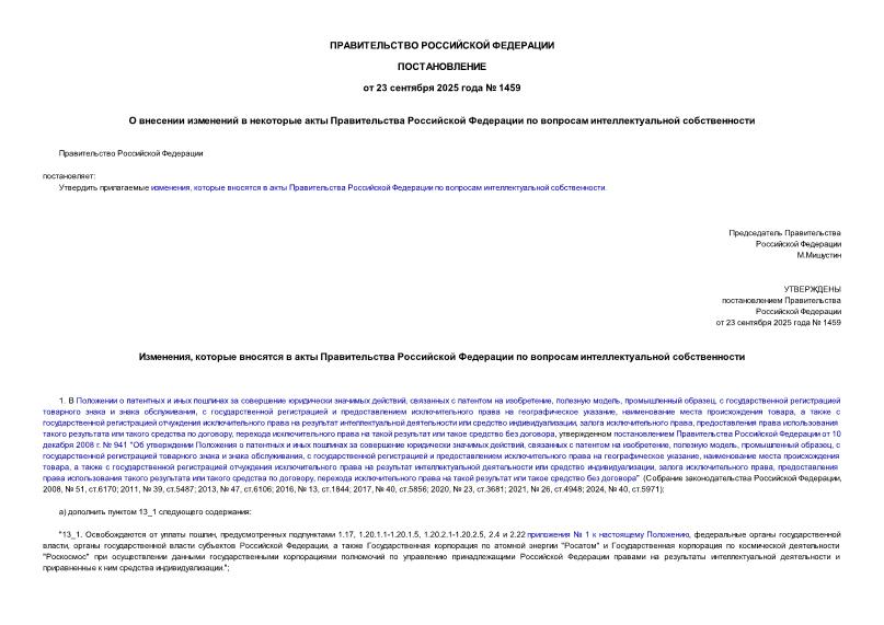 Постановление 1459 О внесении изменений в некоторые акты Правительства Российской Федерации по вопросам интеллектуальной собственности