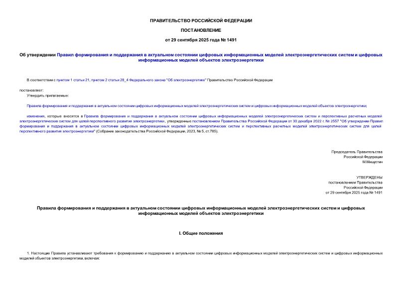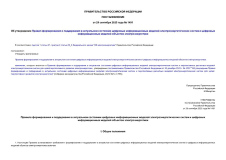 Постановление 1491 Об утверждении Правил формирования и поддержания в актуальном состоянии цифровых информационных моделей электроэнергетических систем и цифровых информационных моделей объектов электроэнергетики