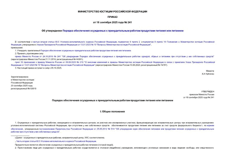 - Об утверждении Порядка организации питания осужденных и лиц, содержащихся под стражей, в учреждениях, исполняющих уголовные наказания в виде лишения свободы, и следственных изоляторах уголовно-исполнительной системы Российской Федерации