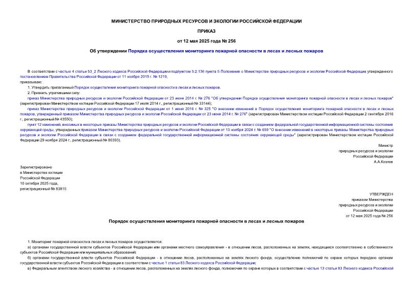 - О внесении изменений в Порядок осуществления мониторинга пожарной опасности в лесах и лесных пожаров, утвержденный приказом Министерства природных ресурсов и экологии Российской Федерации от 23 июня 2014 года N 276