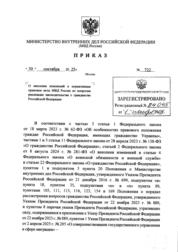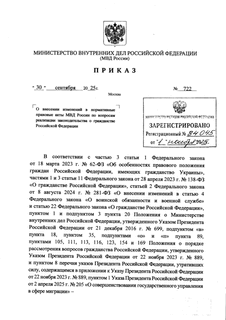 Приказ 722 О внесении изменений в нормативные правовые акты МВД России по вопросам реализации законодательства о гражданстве Российской Федерации