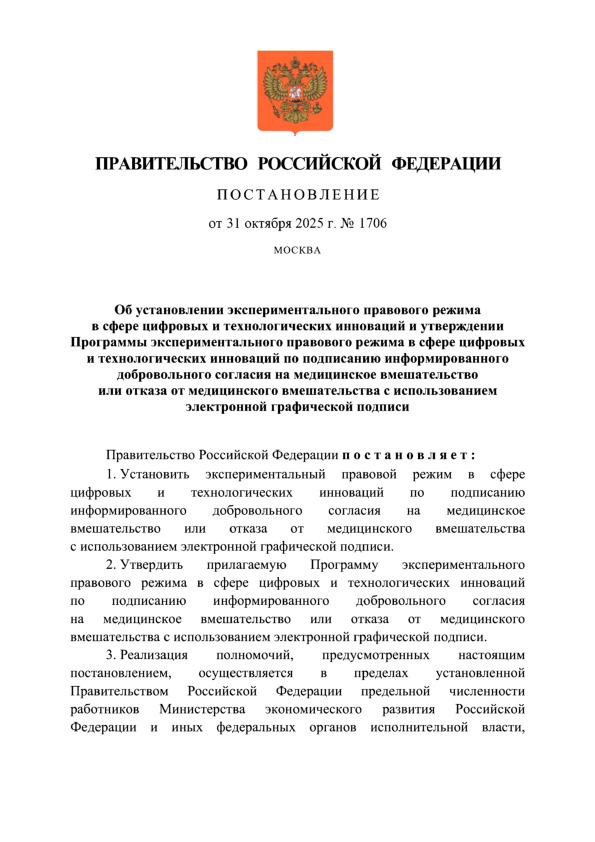 Постановление 1706 Об установлении экспериментального правового режима в сфере цифровых и технологических инноваций и утверждении Программы экспериментального правового режима в сфере цифровых и технологических инноваций по подписанию информированного добровольного согласия на медицинское вмешательство или отказа от медицинского вмешательства с использованием электронной графической подписи