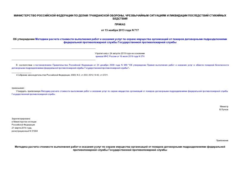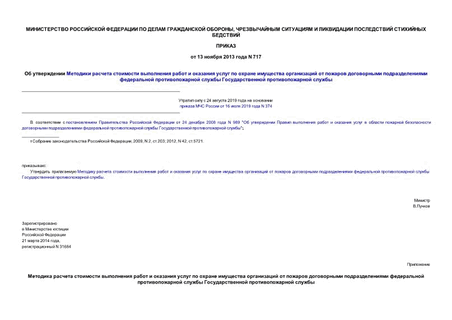 Приказ 717 Об утверждении Методики расчета стоимости выполнения работ и оказания услуг по охране имущества организаций от пожаров договорными подразделениями федеральной противопожарной службы Государственной противопожарной службы