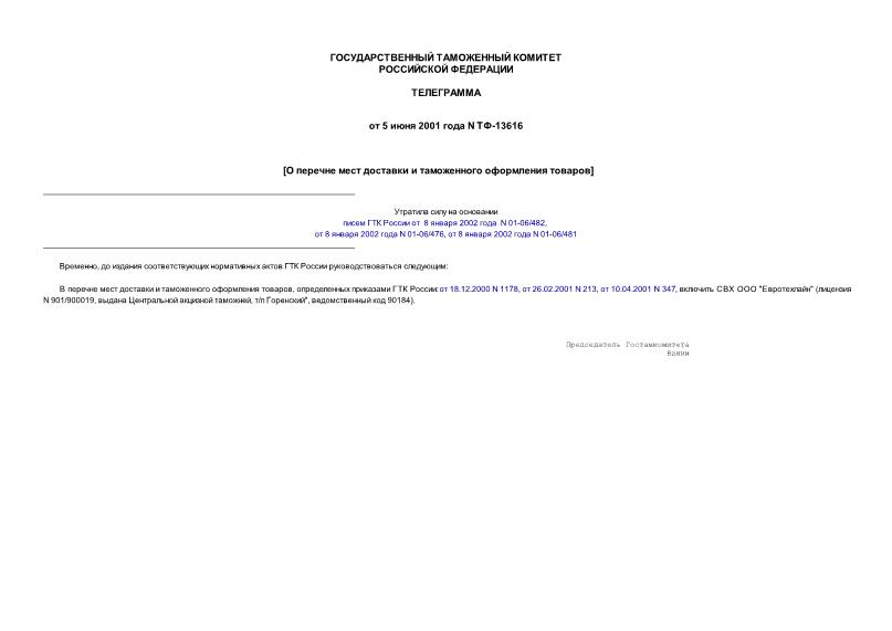 Утвержден: ГТК России; Государственный таможенный комитет РФ, 05.06.2001